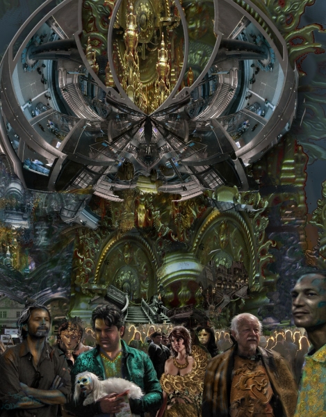 The second shows the Redoubt at the height of its glory. I wanted to show the diversity of cultures. The best way to do that I found is taking figures from a lot of my paintings and putting them all together with a different society at each level. The Redoubt itself I showed as a mixture of high-tech and Gormenghast.