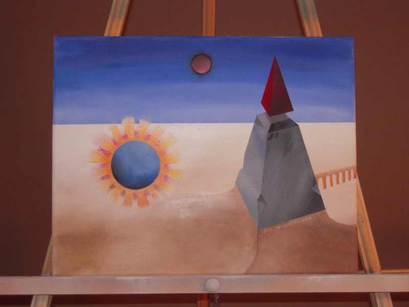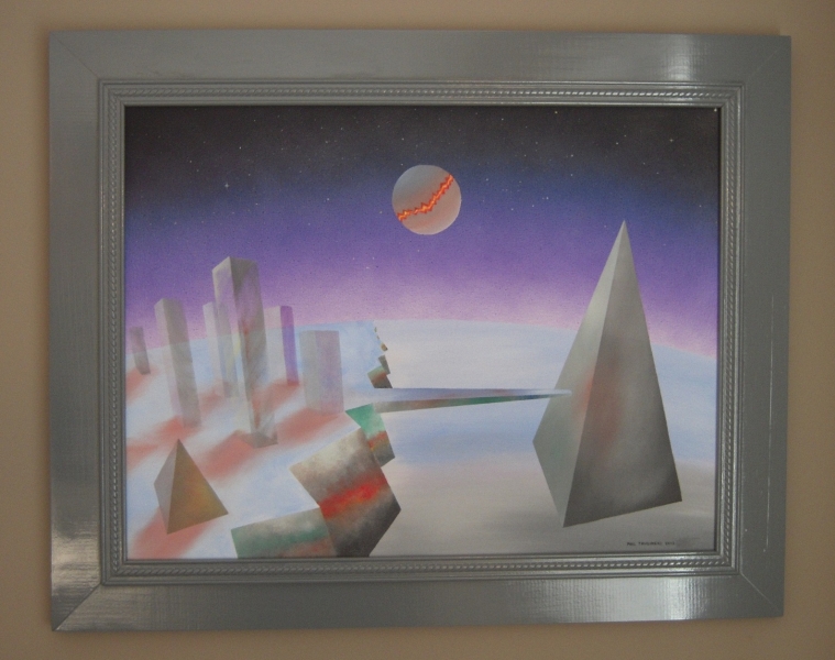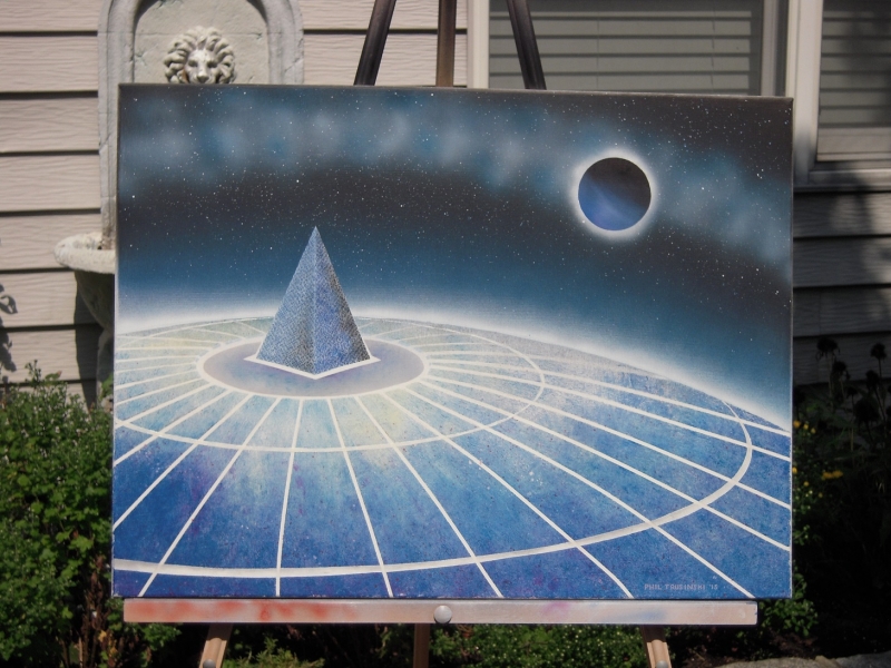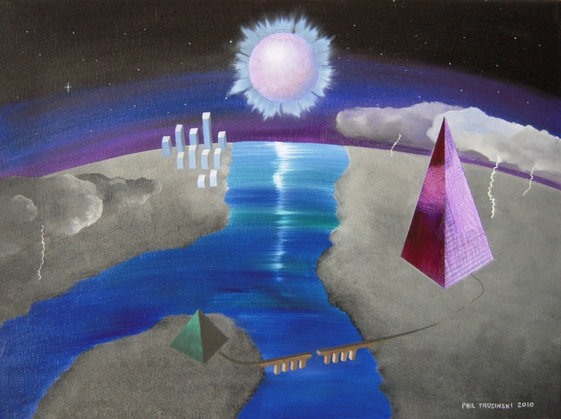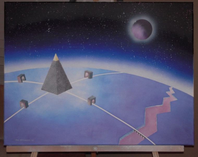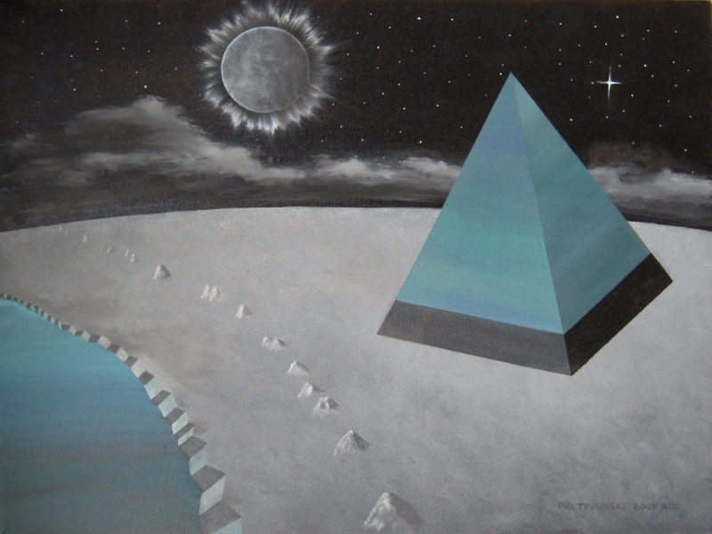 A painting of a pyramid beneath a starry sky with some clouds, and a dark planet.