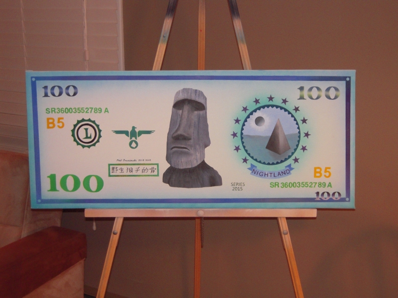 A painting of money, with a moai in the center, and a pyramid beneath a dim sun or moon in a ring on the right.